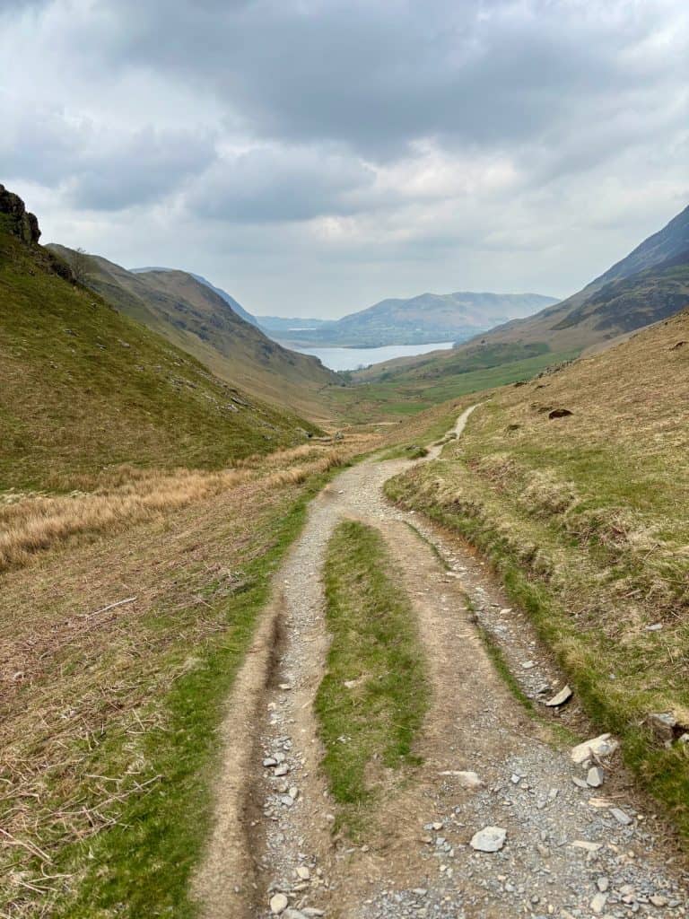 Once you reach the road, instead of heading back uphill, turn left and walk along the road towards Buttermere. Keep an eye out for a path on your left — this marks the start of the trail up Rannerdale Knotts.